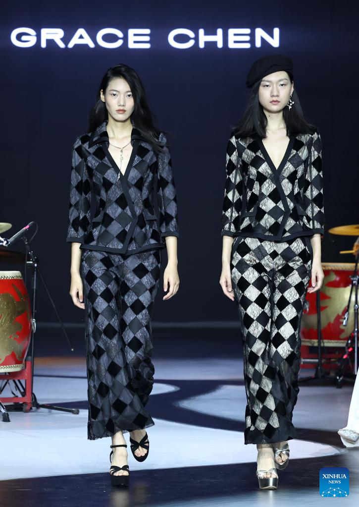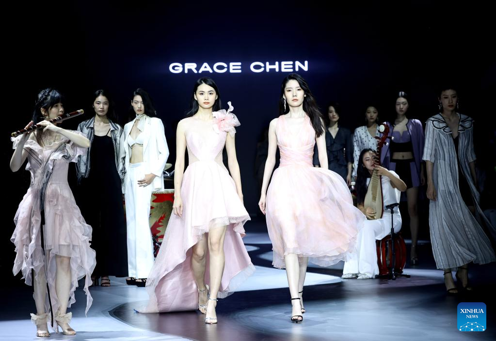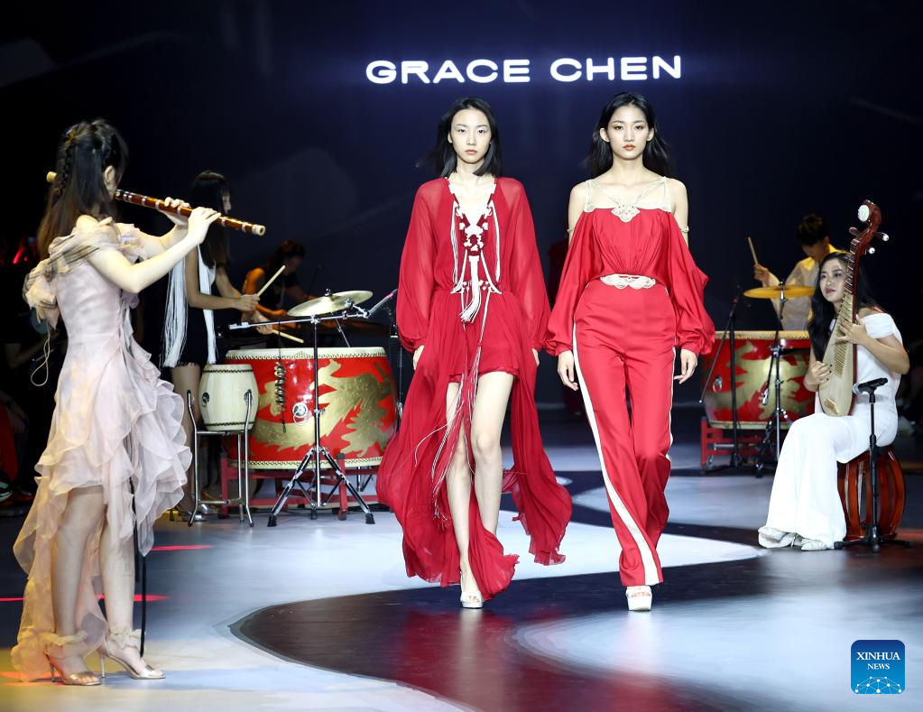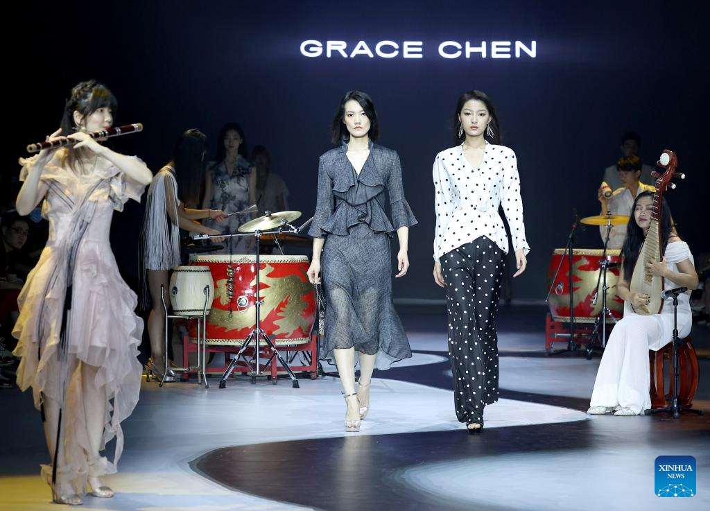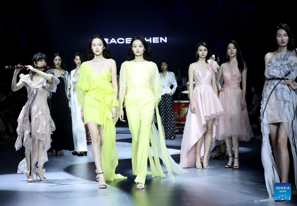 Models present the creations of designer Grace Chen during a fashion week at the second China International Consumer Products Expo (CICPE) in Haikou, south China's Hainan Province, on July 26, 2022. (Xinhua/Chen Jianli)
