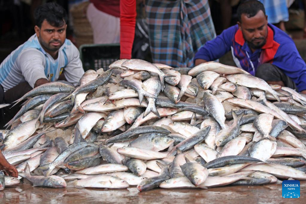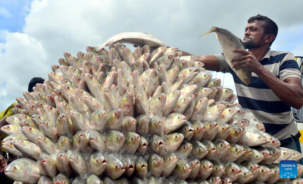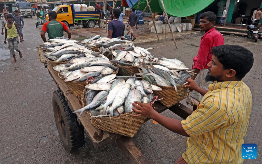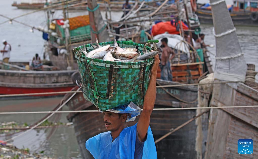 A man unloads Hilsa fish from boats at a fish landing station in Chattogram, Bangladesh, July 25, 2022. Bangladeshi fishermen on Monday restarted fishing in the coastal areas of the Bay of Bengal after a break of 65 days. Bangladesh banned fishing off its coast for 65 days from May 20 in order to help ensure the smooth breeding of fish and boost depleted fish stocks. (Xinhua)