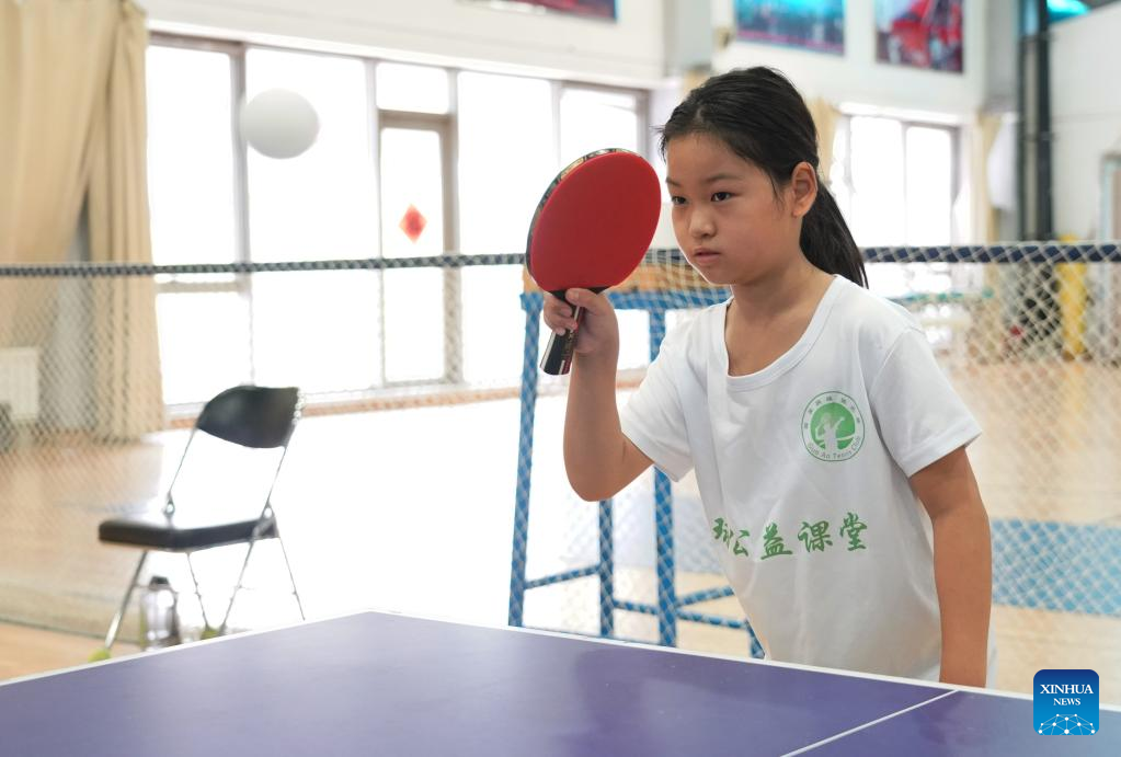 A child plays table tennis as a part of a summer camp program at the National Olympic Sports Center in Beijing, capital of China, July 26, 2022. (Xinhua/Ren Chao)