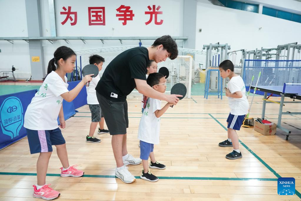 Children practice table tennis skills as a part of a summer camp program at the National Olympic Sports Center in Beijing, capital of China, July 26, 2022. (Xinhua/Ren Chao)