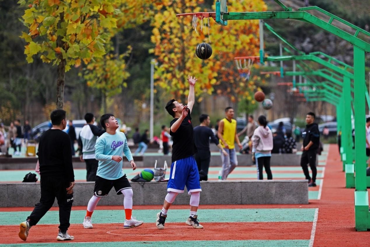 Photo shows people playing basketball at a sports center in Pengshui Miao and Tujia autonomous county, southwest China's Chongqing municipality. (People's Daily/Zhao Yong)
