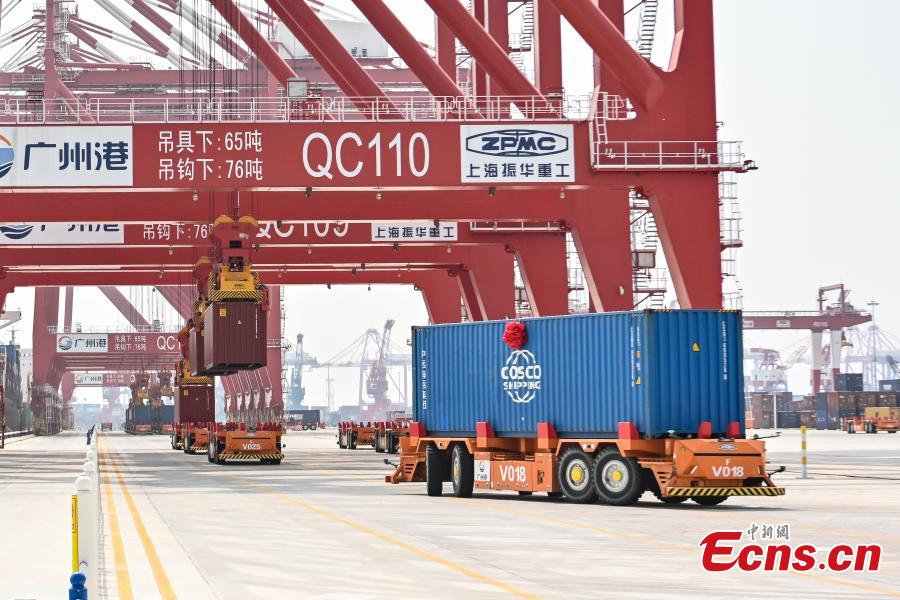 An automated gantry crane loads containers on self-driving trucks at a terminal in the port of Nansha in Guangzhou, south China's Guangdong province, July 28, 2022. (Photo: China News Service/Chen Jimin)