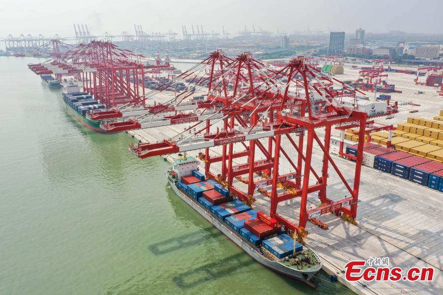 Aerial view shows the Nansha port, world first multimodal service port connects sea, river and railway transportation in Guangzhou, south China's Guangdong Province, July 28, 2022. (Photo: China News Service/Chen Jimin)
