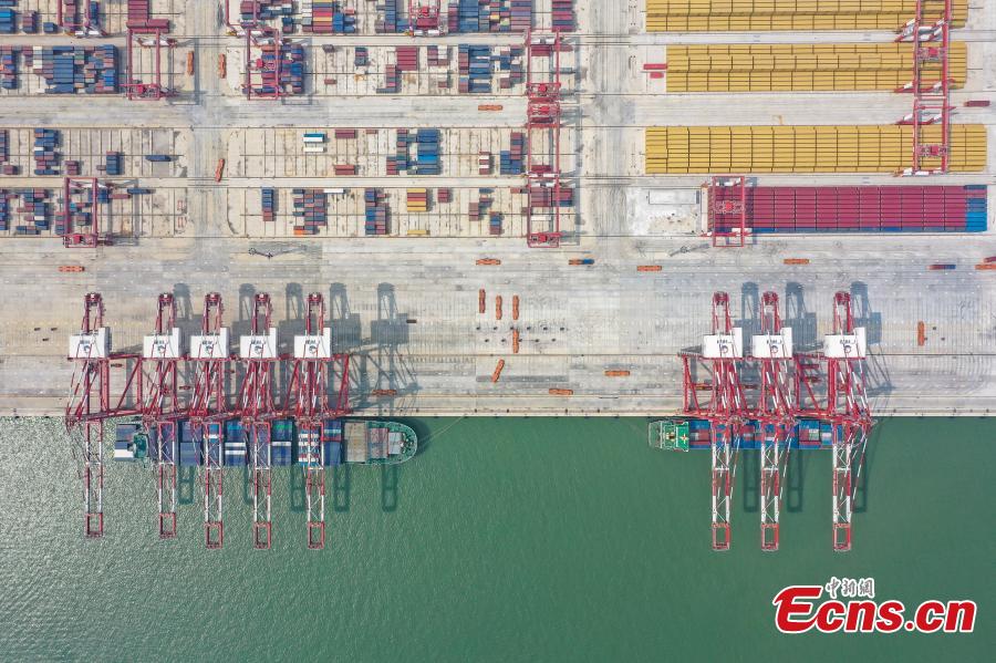 Aerial view shows the Nansha port, world first multimodal service port connects sea, river and railway transportation in Guangzhou, south China's Guangdong Province, July 28, 2022. (Photo: China News Service/Chen Jimin)