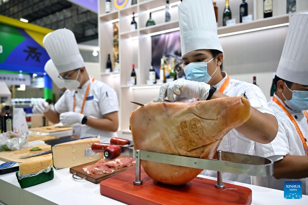 A chef cuts slices of Prosciutto di Parma at the second China International Consumer Products Expo (CICPE) in Haikou, south China's Hainan Province, July 26, 2022. (Xinhua/Guo Cheng)