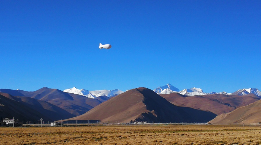 "Jimu-1" No. 3 airship platform flies over Mount Qomolangma during China's second scientific research survey on the Qinghai-Tibet Plateau. The airship is equipped with multiple scientific devices. (Photo courtesy of the Institute of Tibetan Plateau Research, Chinese Academy of Sciences)