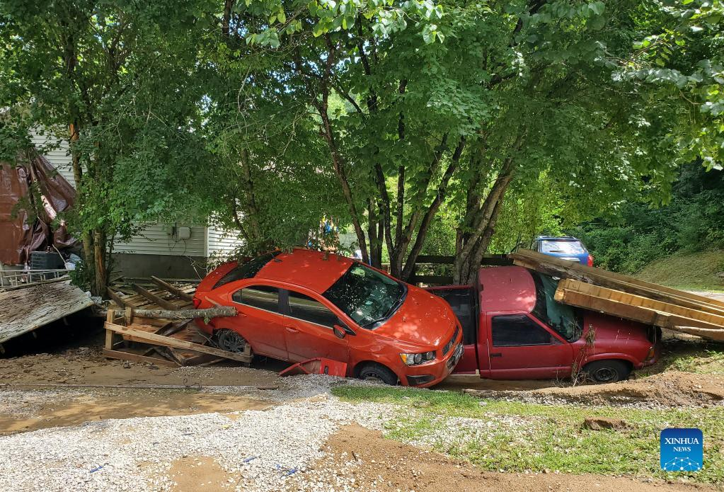 Photo taken on July 30, 2022 shows vehicles destroyed by heavy rain-caused flooding in Central Appalachia in Kentucky, the United States. The death toll from the heavy rain-caused flooding hitting eastern Kentucky rose to at least 25, including four children from one family, Kentucky Governor Andy Beshear confirmed Saturday. (Photo by Wang Changzheng/Xinhua)