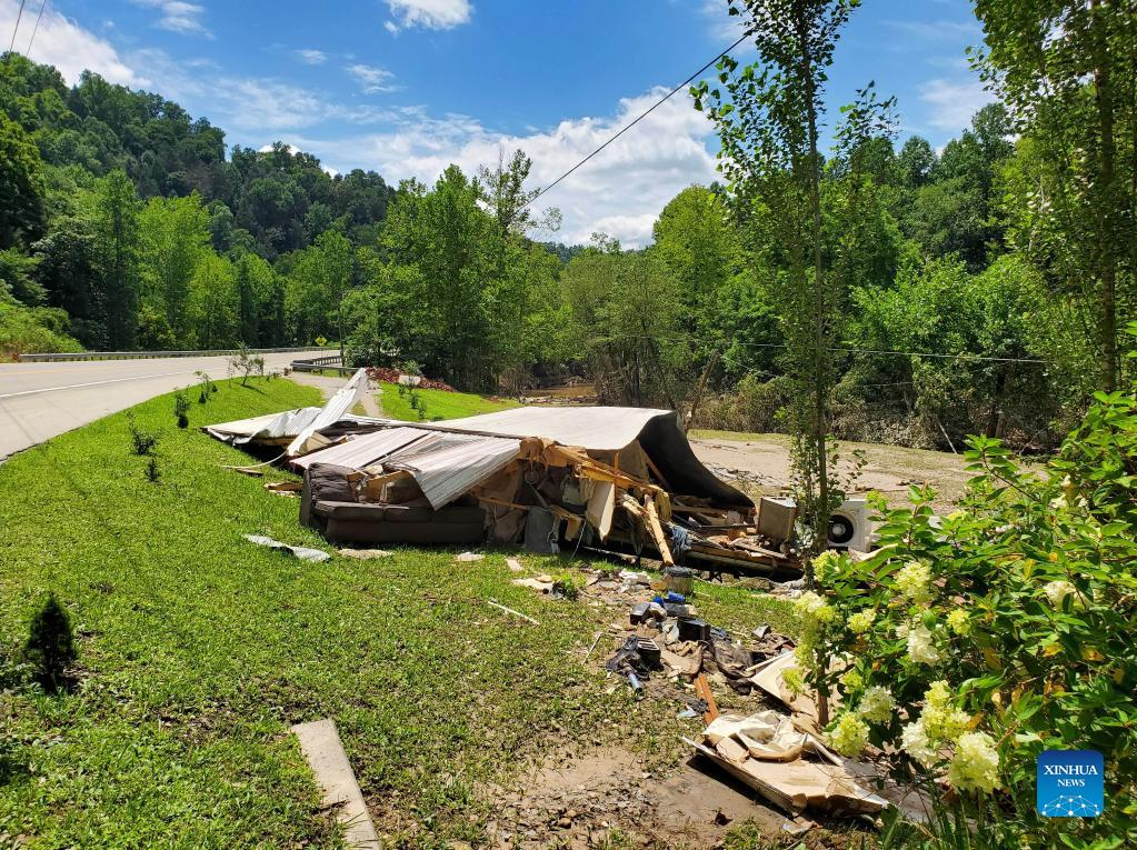 Photo taken on July 30, 2022 shows houses destroyed by heavy rain-caused flooding in Central Appalachia in Kentucky, the United States. The death toll from the heavy rain-caused flooding hitting eastern Kentucky rose to at least 25, including four children from one family, Kentucky Governor Andy Beshear confirmed Saturday. (Photo by Wang Changzheng/Xinhua)