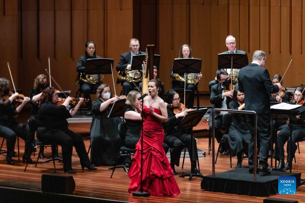 Photo taken on July 30, 2022 shows the opening performance of "Jasmine Flower" by Australian conductor Guy Noble at the "East Meets West" orchestral concert in Llewellyn Hall at the Australian National University in Canberra, Australia. "East Meets West" orchestral concert tour in Australia was held in Canberra on Saturday night. (Photo by Chu Chen/Xinhua)