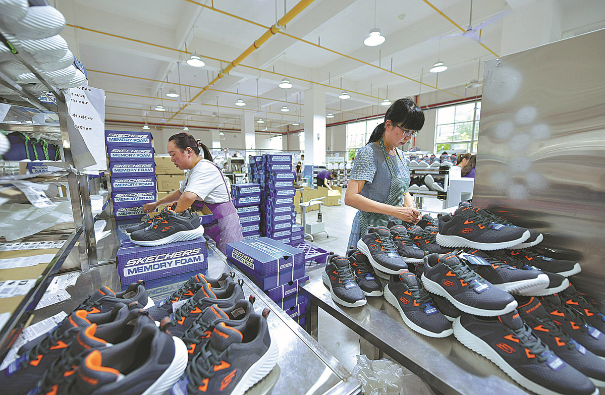 Employees pack shoes at a footwear company in Xuanen county, Hubei province. [Photo/Xinhua]