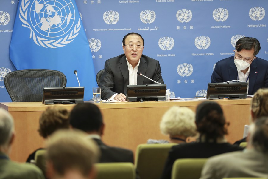Zhang Jun, China's permanent representative to the United Nations, speaks at a press briefing on China's Security Council presidency for the month of August at UN Headquarters in New York on Aug. 1, 2022. (Xinhua/Xie E)