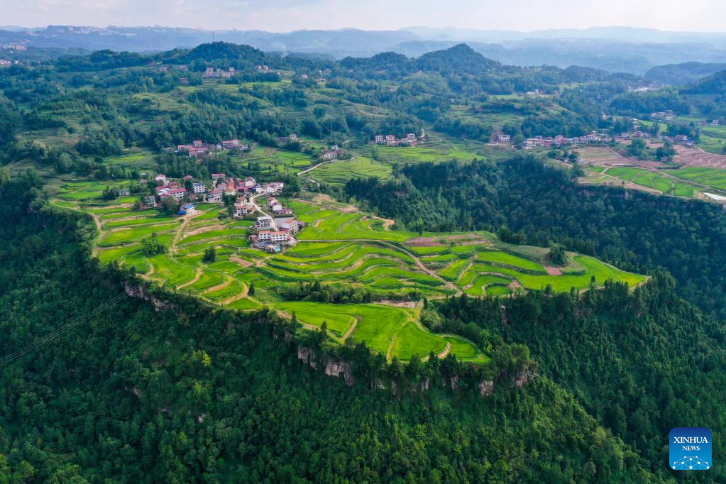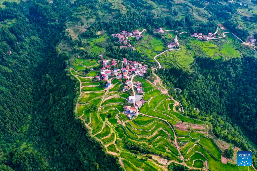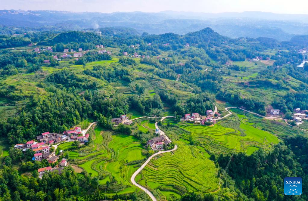 Aerial photo taken on Aug. 2, 2022 shows a view of Bayi Village in Wanzhou District of southwest China's Chongqing. (Xinhua/Wang Quanchao)