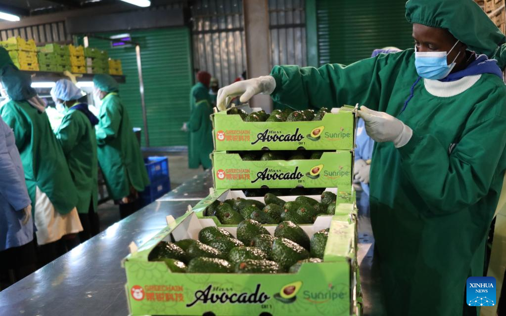 A staff member arranges boxes of fresh avocados at Sunripe factory in Limuru Town, Kiambu County, Kenya, on Aug. 2, 2022. The first batch of fresh avocados grown in Kenya and destined for the Chinese market was flagged off Tuesday at a ceremony attended by senior government officials, diplomats, and industry executives. Kenya became the first African country to export fresh avocados to China in a move set to further boost the economic ties between the two countries. (Xinhua/Dong Jianghui)
