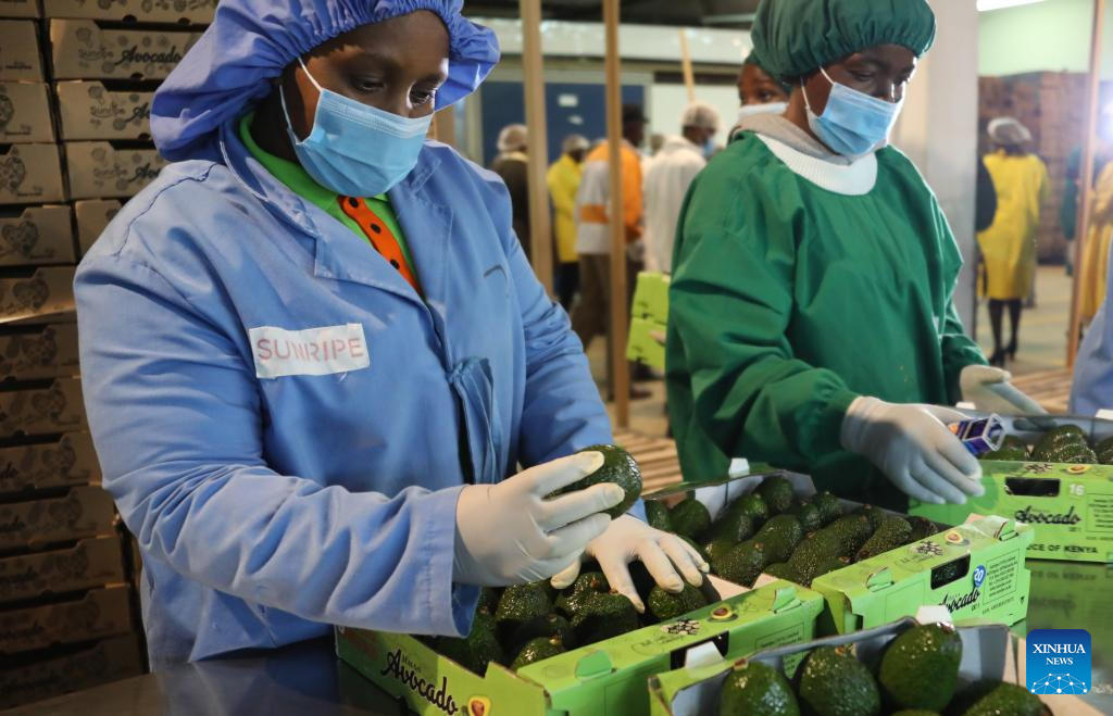 Staff members put fresh avocados into boxes at Sunripe factory in Limuru Town, Kiambu County, Kenya, on Aug. 2, 2022. The first batch of fresh avocados grown in Kenya and destined for the Chinese market was flagged off Tuesday at a ceremony attended by senior government officials, diplomats, and industry executives. Kenya became the first African country to export fresh avocados to China in a move set to further boost the economic ties between the two countries. (Xinhua/Dong Jianghui)