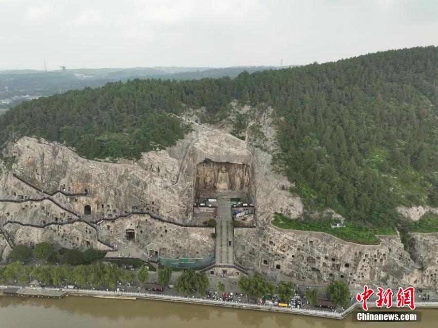 Photo taken on Aug. 2, 2022 shows the restored giant Buddha statue of Lushena in the Longmen Grottoes in Luoyang, central China's Henan Province. (Photo: China News Service/Hu Pengda)