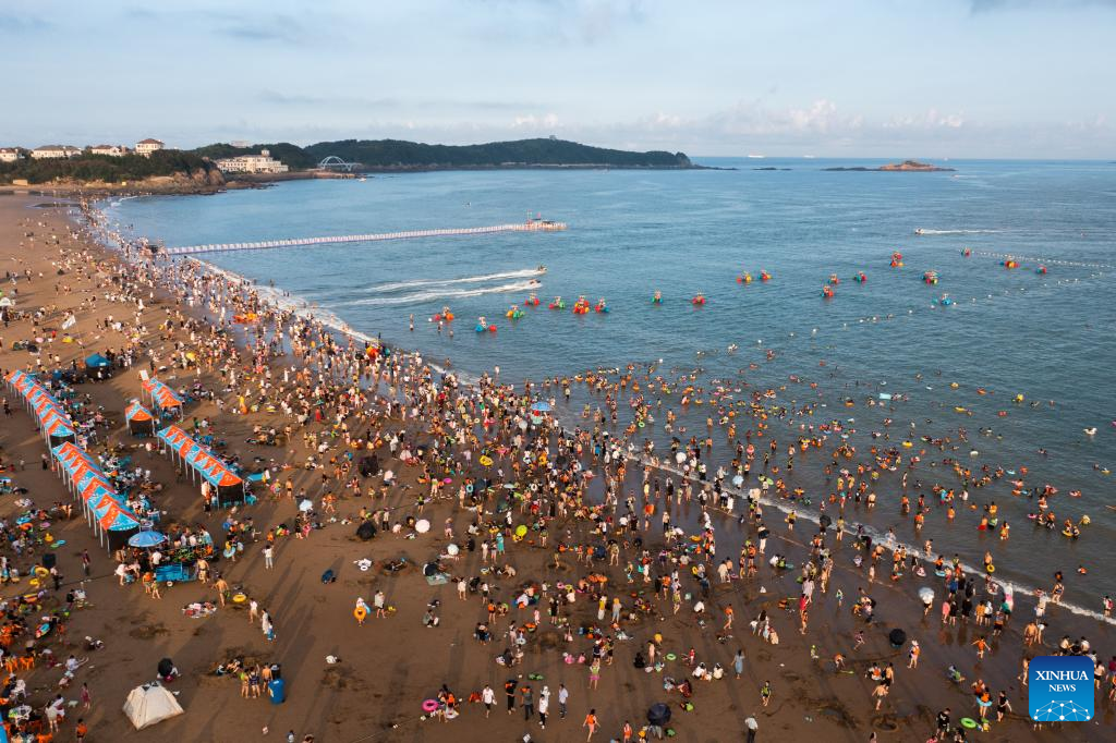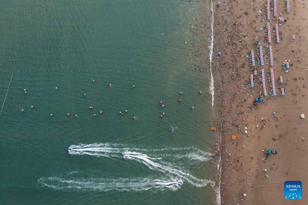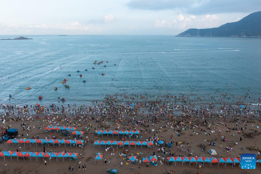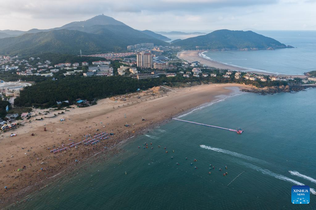 Aerial photo taken on Aug. 2, 2022 shows tourists enjoying seaside time in Zhujiajian scenic spot in Zhoushan, east China's Zhejiang Province. Zhujiajian scenic spot has provided various seaside entertainments for tourists to boost tourism during the summer vacation. (Xinhua/Xu Yu)