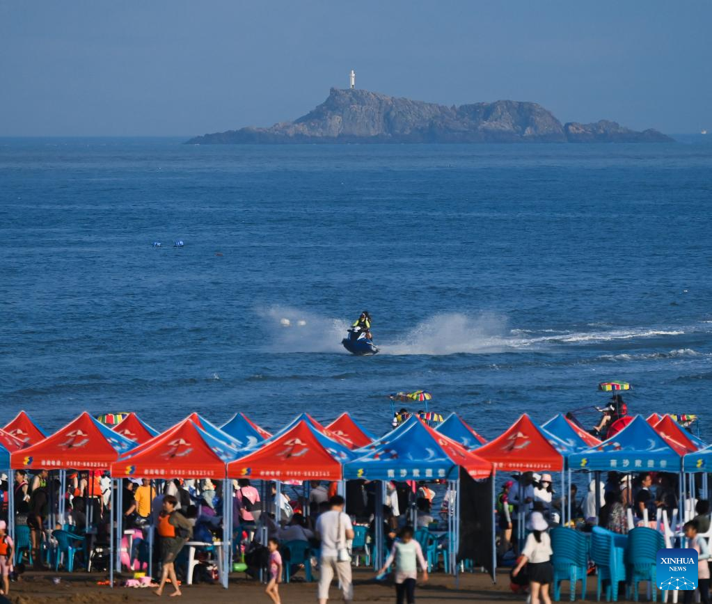 Tourists enjoy seaside time in Zhujiajian scenic spot in Zhoushan, east China's Zhejiang Province, Aug. 3, 2022. Zhujiajian scenic spot has provided various seaside entertainments for tourists to boost tourism during the summer vacation. (Xinhua/Xu Yu)