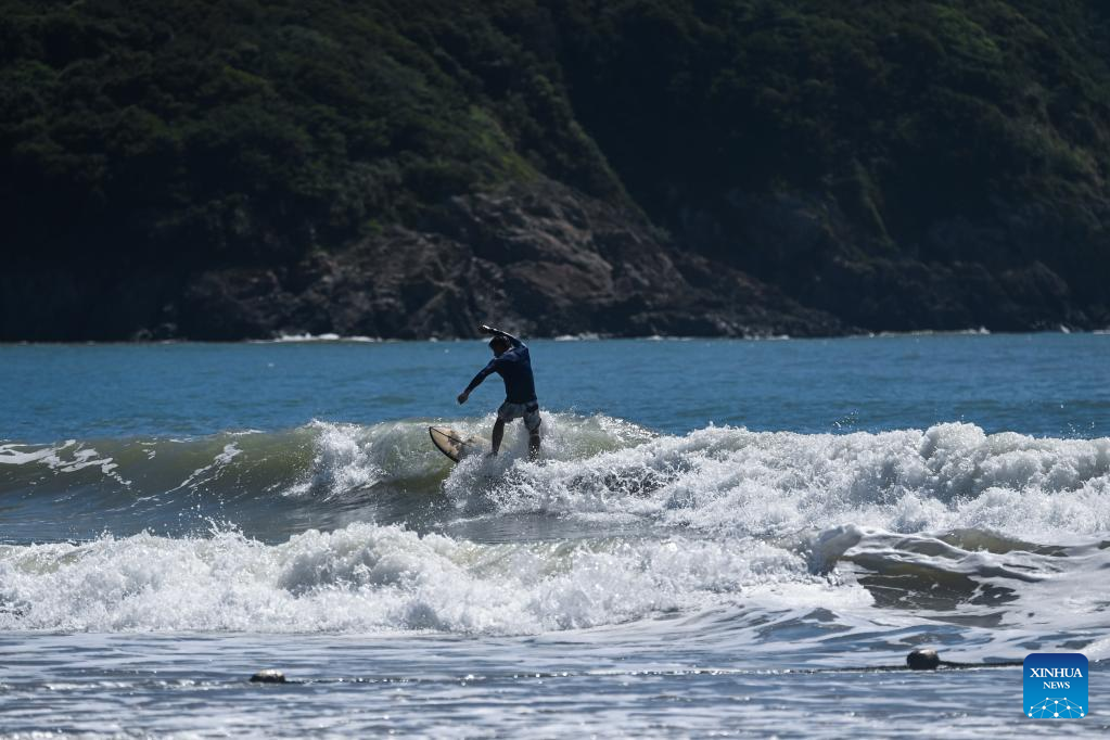 A tourist surfs in Zhujiajian scenic spot in Zhoushan, east China's Zhejiang Province, Aug. 3, 2022. Zhujiajian scenic spot has provided various seaside entertainments for tourists to boost tourism during the summer vacation. (Xinhua/Xu Yu)