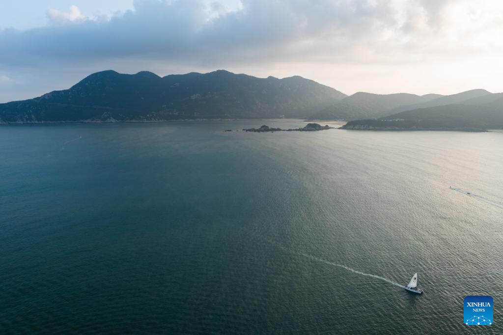 Aerial photo taken on Aug. 2, 2022 shows a sailboat in Zhujiajian scenic spot in Zhoushan, east China's Zhejiang Province. Zhujiajian scenic spot has provided various seaside entertainments for tourists to boost tourism during the summer vacation. (Xinhua/Xu Yu)