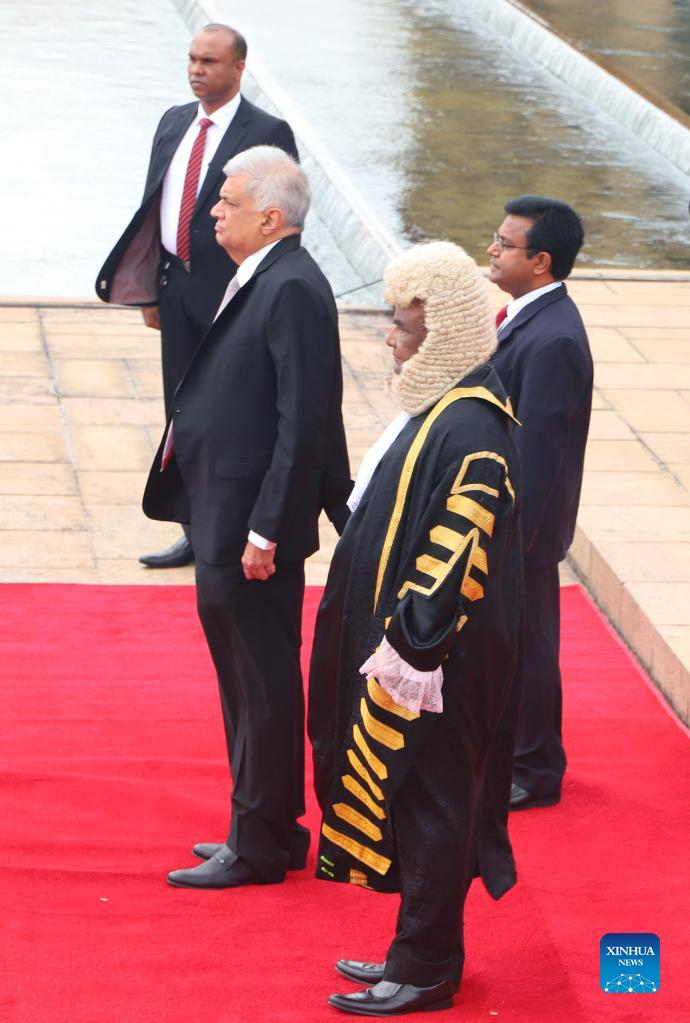 Sri Lankan President Ranil Wickremesinghe receives the guard of honor for the ceremonial opening of the third session of the 9th Parliament in Sri Jayawardenepura Kotte, Sri Lanka, Aug. 3, 2022. Sri Lankan President Ranil Wickremesinghe on Wednesday urged political parties to join him in establishing an all-party government that can lead Sri Lanka out of the economic crisis. In delivering the government's policy statement following the ceremonial opening of the third session of the 9th Parliament, Wickremesinghe said that he has already started discussions with political parties on the matter. (Photo by Ajith Perera/Xinhua)