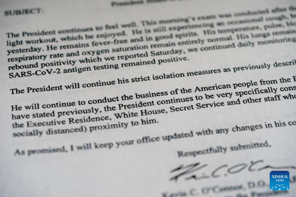 Photo taken in Arlington, the United States, on Aug. 3, 2022 shows an update from White House physician Dr. Kevin O'Connor on U.S. President Joe Biden's COVID-19 case. Biden is "still experiencing an occasional cough," his doctor said on Wednesday. (Xinhua/Liu Jie)
