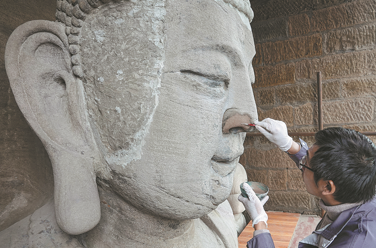 Repairs are made to a 14th century sculpture in a grotto near the Yangtze River in Chongqing. XINHUA