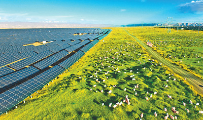 Photo shows a wasteland that has been turned into a green pasture in recent years thanks to the construction of a photovoltaic power generation park, with an animal husbandry industry having also been developed inside the same park. (Photo/People’s Daily)