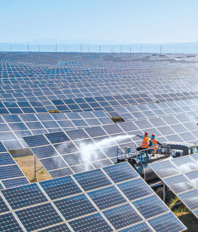 Photo shows workers cleaning solar panels inside a photovoltaic power generation park. (Photo/People’s Daily)