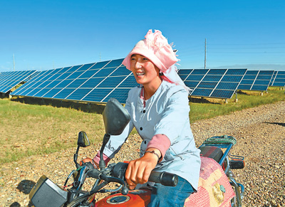 As the sun set, Sonam Drolma rode a motorcycle, following a herd of sheep as they went towards home on the lush green grounds of a photovoltaic power generation park covering an area over 100 square kilometers located in the Hainan Tibetan Autonomous Prefecture, northwest China’s Qinghai Province.