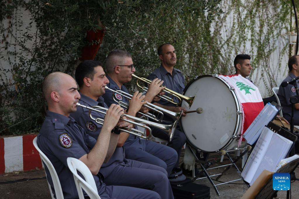 A band performs during a memorial event held at the Beirut Fire Brigade's headquarters in Beirut, Lebanon, on Aug. 3, 2022. The Beirut Fire Brigade held a memorial event on Wednesday to pay tribute to the firefighters who lost their lives in Beirut port explosion on Aug. 4, 2020. (Xinhua/Liu Zongya)
