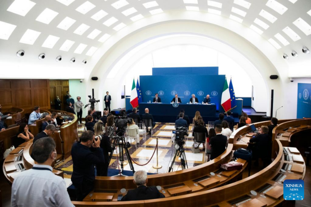 Italian Prime Minister Mario Draghi (3rd R, Rear) attends a press conference in Rome, Italy, on Aug. 4, 2022. Mario Draghi on Thursday announced an aid package worth an estimated 17 billion euros (17.3 billion U.S. dollars) to combat surging inflation and drought. (Photo by Alberto Lingria/Xinhua)