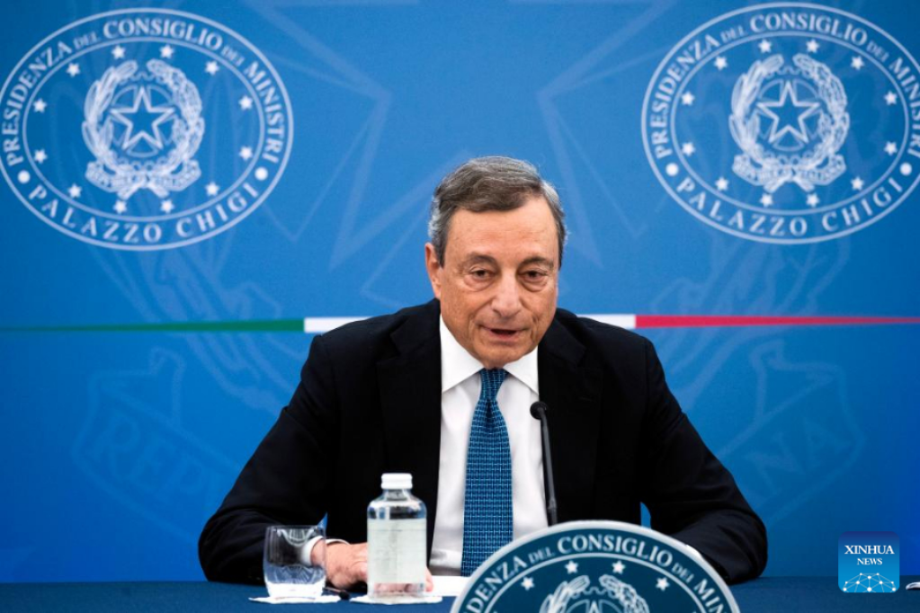 Italian Prime Minister Mario Draghi speaks at a press conference in Rome, Italy, on Aug. 4, 2022. Mario Draghi on Thursday announced an aid package worth an estimated 17 billion euros (17.3 billion U.S. dollars) to combat surging inflation and drought. (Photo by Alberto Lingria/Xinhua)