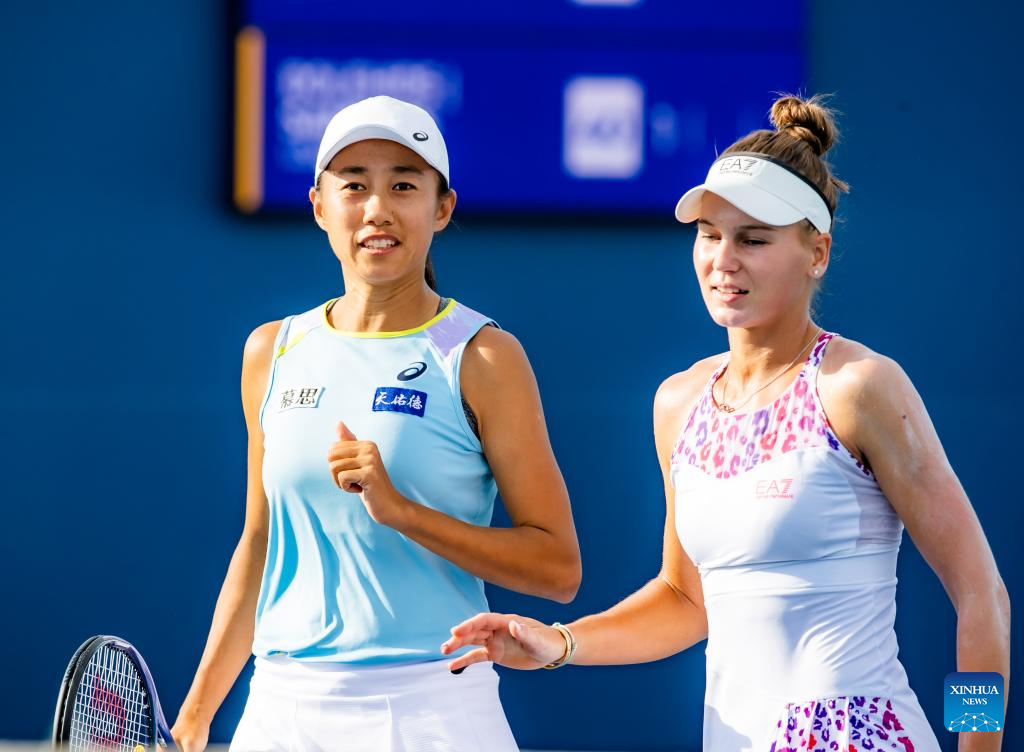 Zhang Shuai (R)/Veronika Kudermetova compete during the women's doubles quarterfinal against Caroline Dolehide/Storm Sanders at the 2022 Mubadala Silicon Valley Classic in San Jose, California, the United States, Aug. 4, 2022. (Photo by Arthur Dong/Xinhua)