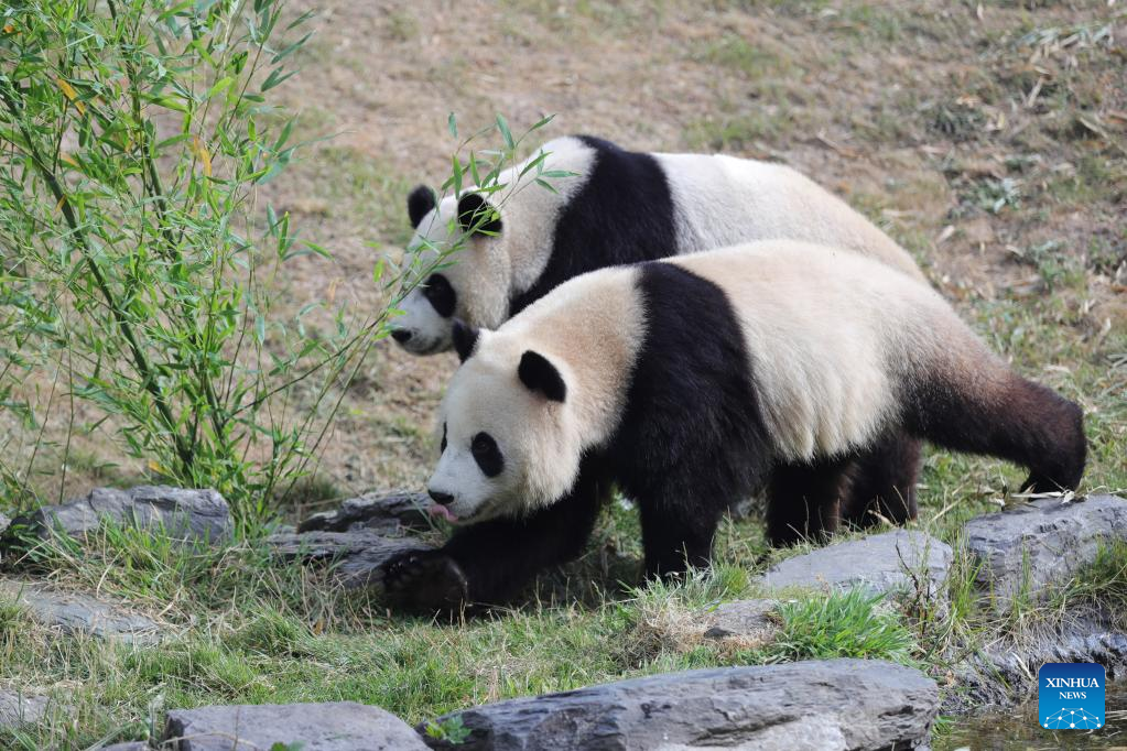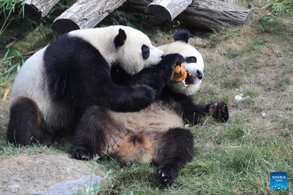 Giant panda twins "Bao Di" (bottom) and "Bao Mei" walk towards their birthday meal at the Pairi Daiza zoo in Brugelette, Belgium, Aug. 6, 2022. The celebration of the third birthday of the panda twins Bao Di and Bao Mei, born on Aug. 8, 2019 to Hao Hao and Xing Hui, was held at the Pairi Daiza zoo on Saturday. (Xinhua/Zheng Huansong)