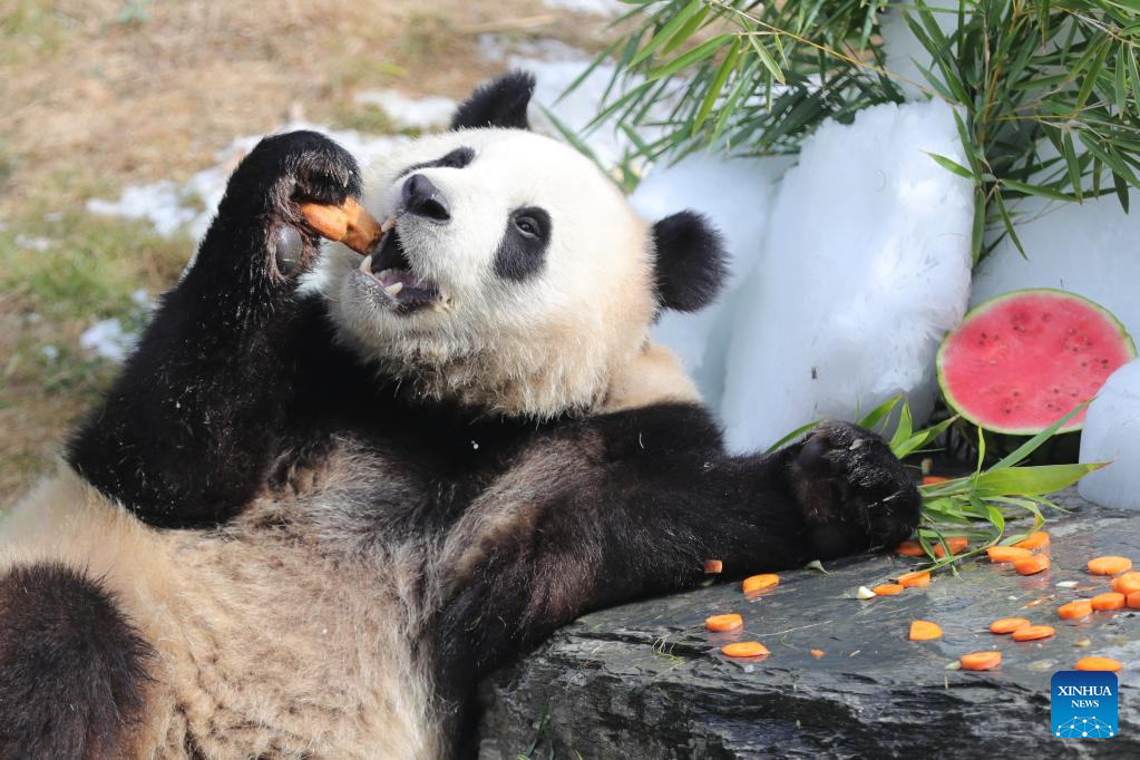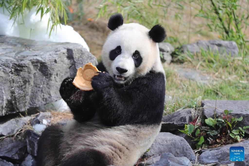 Giant panda "Bao Mei" has birthday meal at the Pairi Daiza zoo in Brugelette, Belgium, Aug. 6, 2022. The celebration of the third birthday of the panda twins Bao Di and Bao Mei, born on Aug. 8, 2019 to Hao Hao and Xing Hui, was held at the Pairi Daiza zoo on Saturday. (Xinhua/Zheng Huansong)