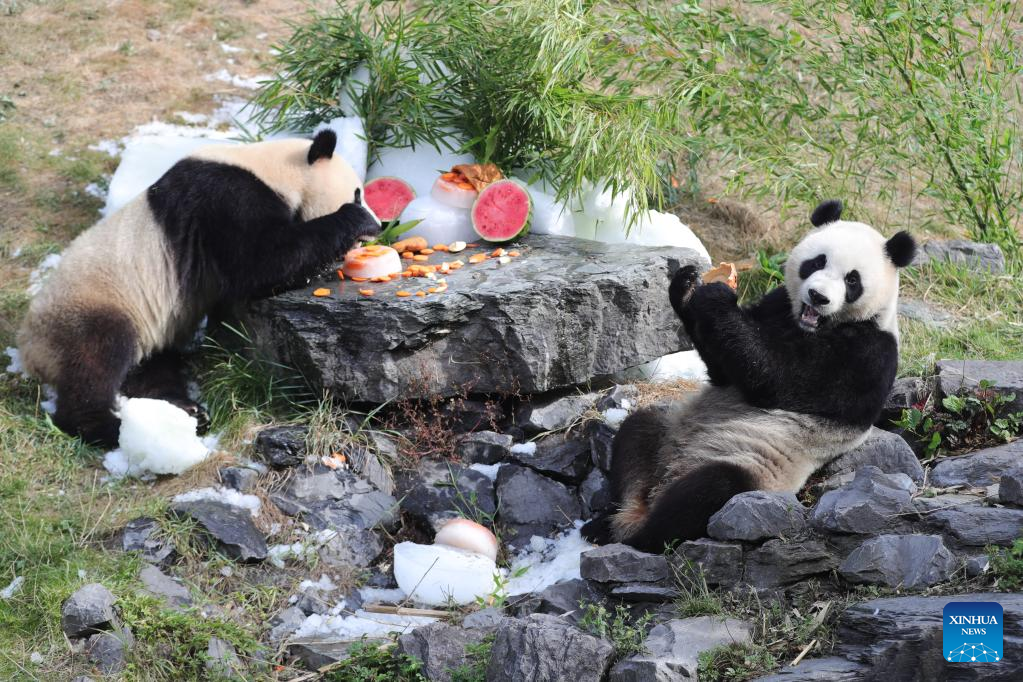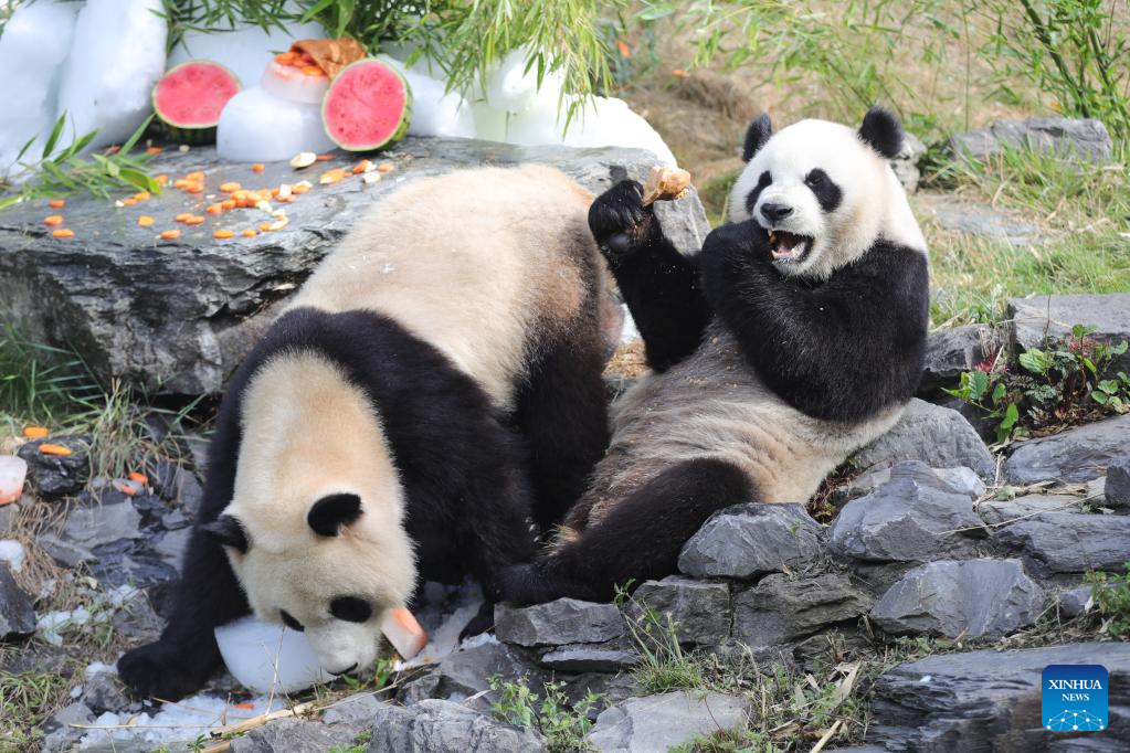 Giant panda twins "Bao Di" (L) and "Bao Mei" have birthday meal at the Pairi Daiza zoo in Brugelette, Belgium, Aug. 6, 2022. The celebration of the third birthday of the panda twins Bao Di and Bao Mei, born on Aug. 8, 2019 to Hao Hao and Xing Hui, was held at the Pairi Daiza zoo on Saturday. (Xinhua/Zheng Huansong)