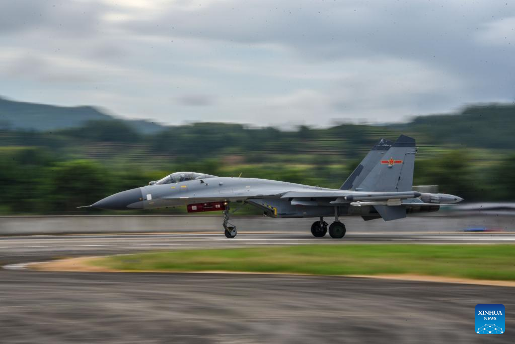A warplane of the Eastern Theater Command of the Chinese People's Liberation Army (PLA) takes off during joint combat training exercises around the Taiwan Island, Aug. 7, 2022. The Eastern Theater Command continued its joint combat training exercises as scheduled on Sunday in the waters and airspace around the Taiwan Island.