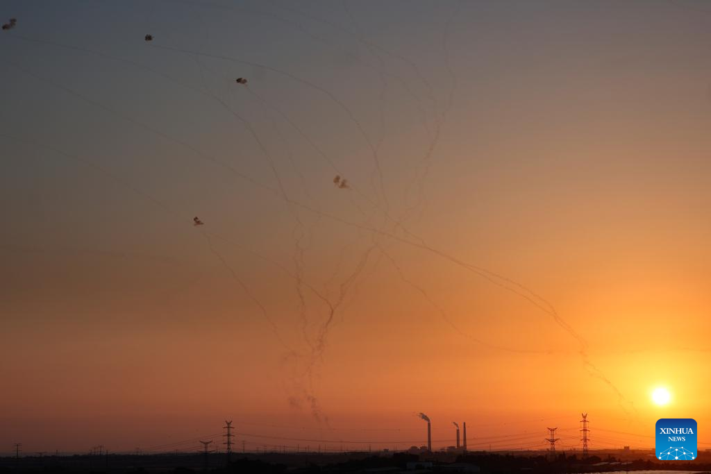 Streaks of smoke are seen as Israel's Iron Dome defense system intercepts rockets launched from the Gaza Strip, as seen from Ashkelon, southern Israel, on Aug. 7, 2022. Israel confirmed on Sunday it has agreed an Egyptian-brokered cease-fire with the Palestinian Islamic Jihad (PIJ) in the Gaza Strip, ending the deadly Israeli airstrikes and the barrage of Palestinian rockets for three days. (Ilan Assayag/JINI via Xinhua)