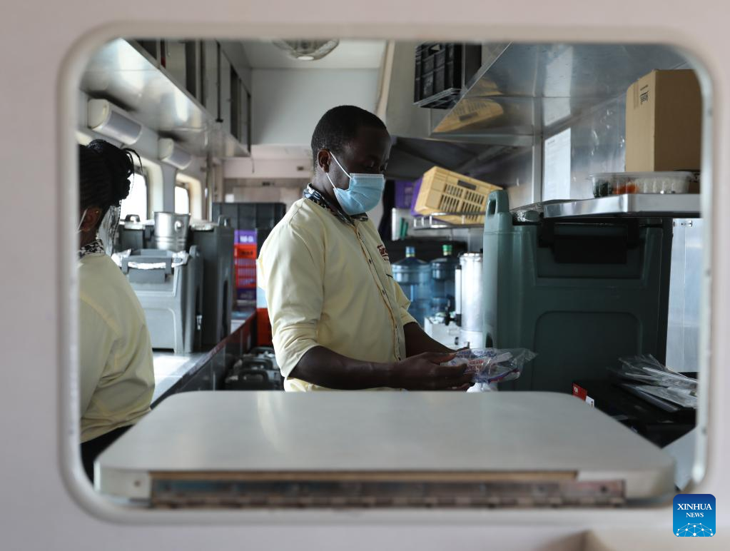 Mark works in the kitchen of a Mombasa-Nairobi Railway passenger train, July 29, 2022. Launched on May 31, 2017, the 480 km Mombasa-Nairobi Standard Gauge Railway (SGR), financed mainly by China and constructed by China Road and Bridge Corporation (CRBC), has fostered job creation for local people.