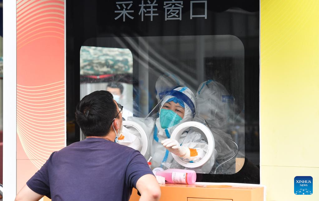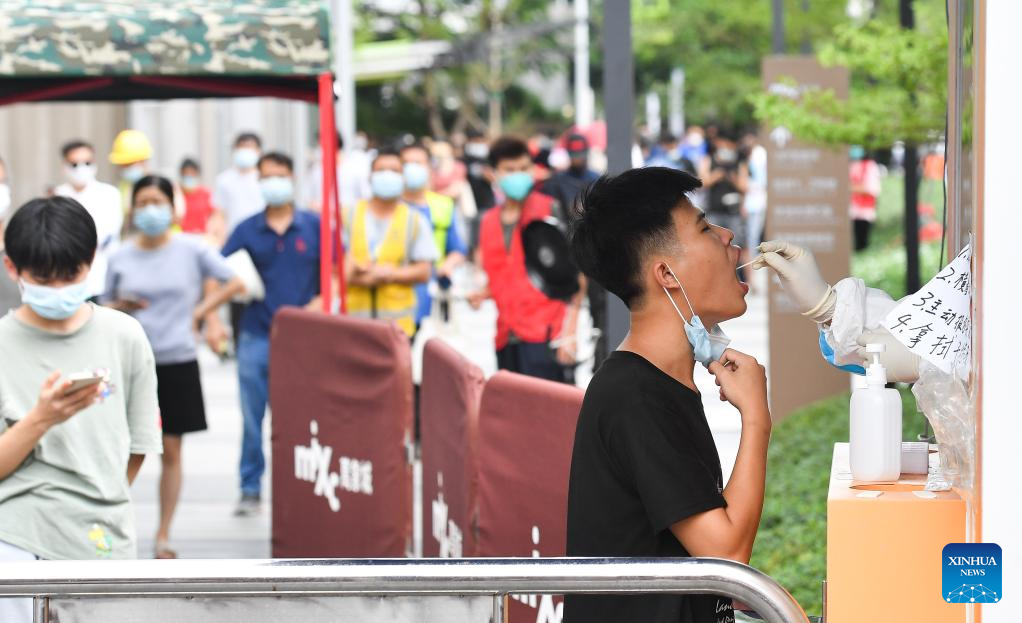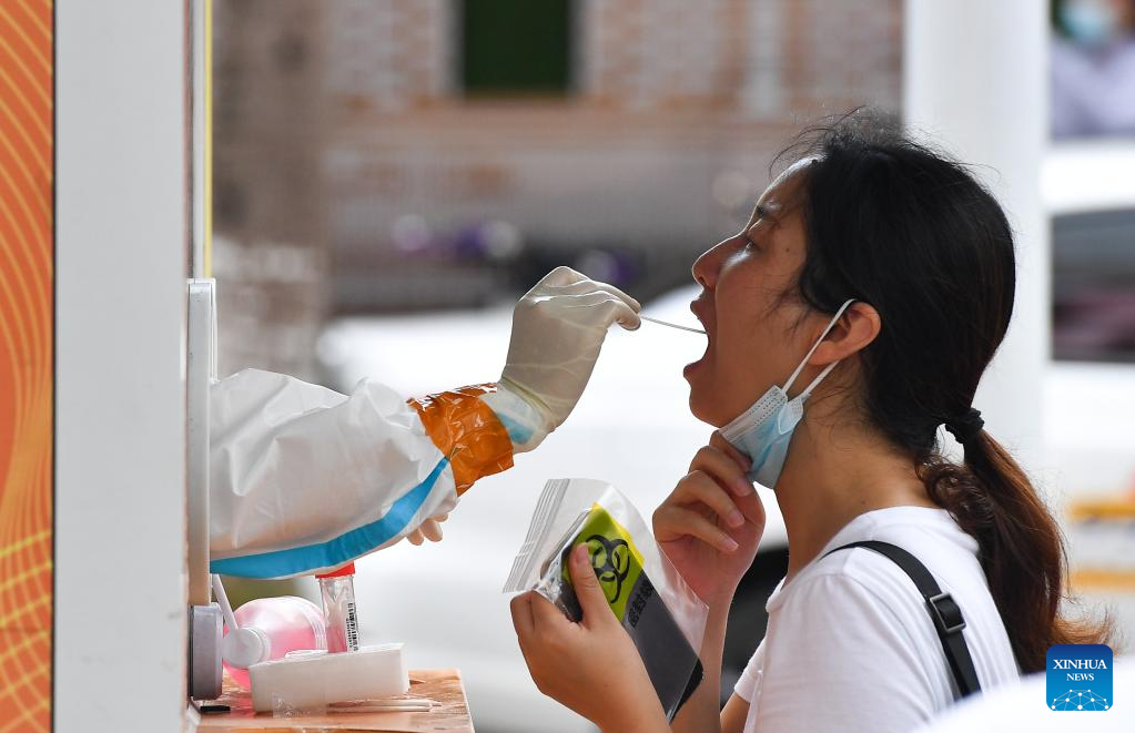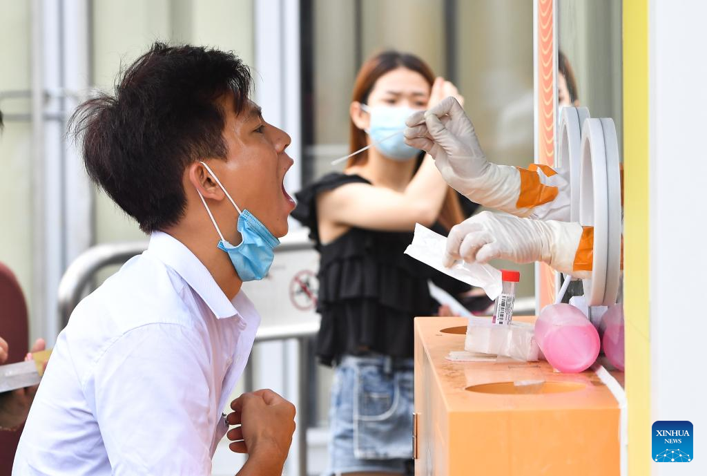 A resident receives a nucleic acid test at a testing site in Longhua District of Haikou, south China's Hainan Province, Aug. 7, 2022. The Chinese mainland Saturday reported 337 locally-transmitted confirmed COVID-19 cases, of which 297 were in Hainan, the National Health Commission said Sunday. (Xinhua/Yang Guanyu)