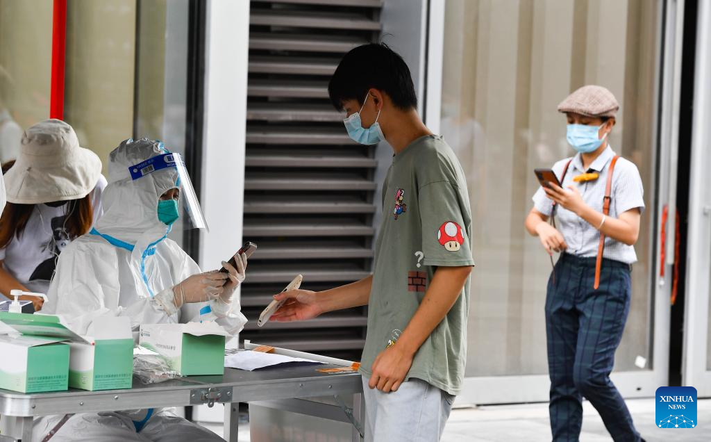 A resident registers for a nucleic acid test at a testing site in Longhua District of Haikou, south China's Hainan Province, Aug. 7, 2022. The Chinese mainland Saturday reported 337 locally-transmitted confirmed COVID-19 cases, of which 297 were in Hainan, the National Health Commission said Sunday. (Xinhua/Yang Guanyu)