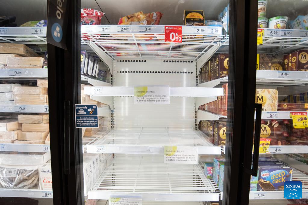 Photo taken on Aug. 7, 2022 shows empty shelves of ice cubes in a supermarket in Madrid, Spain. Spain is witnessing a serious shortage of bags of ice, due to high production and storage costs caused by rapid increase in electricity prices as well as high demand brought about by hot weather. (Photo by Gustavo Valiente/Xinhua)