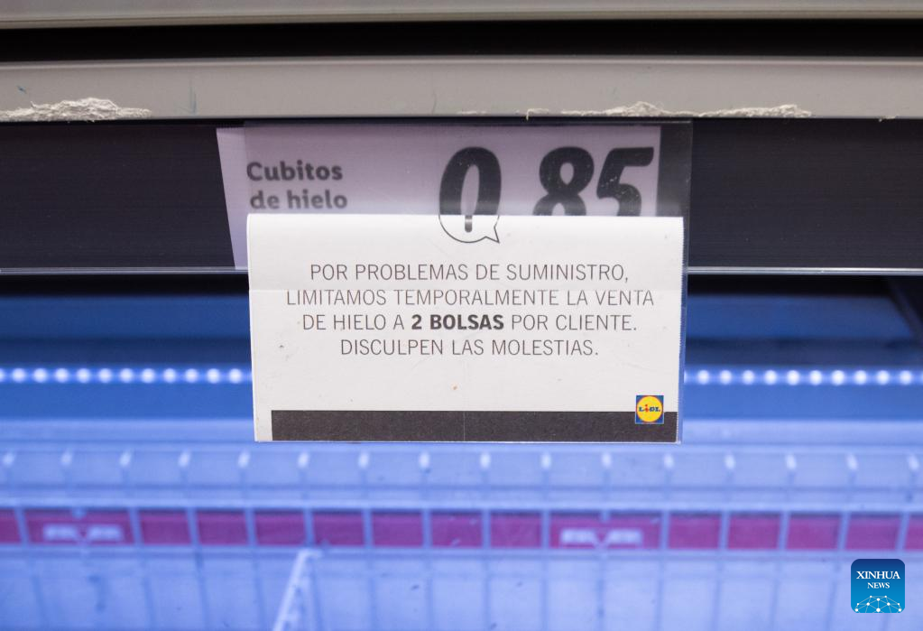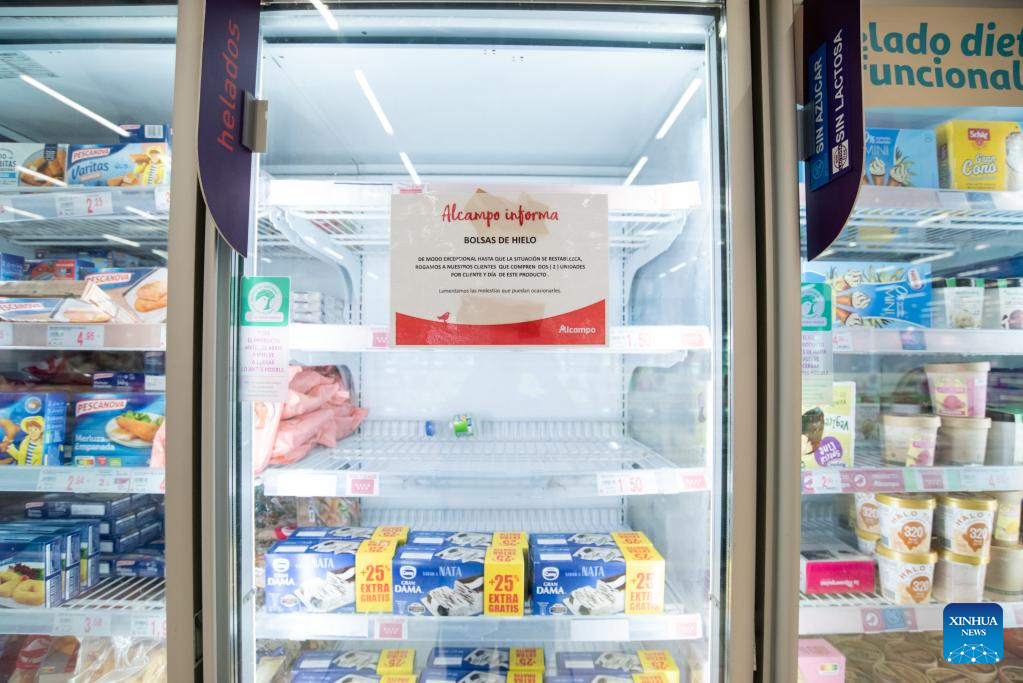 Photo taken on Aug. 7, 2022 shows a notice of purchase limits on ice cubes in a supermarket in Madrid, Spain. Spain is witnessing a serious shortage of bags of ice, due to high production and storage costs caused by rapid increase in electricity prices as well as high demand brought about by hot weather. (Photo by Gustavo Valiente/Xinhua)