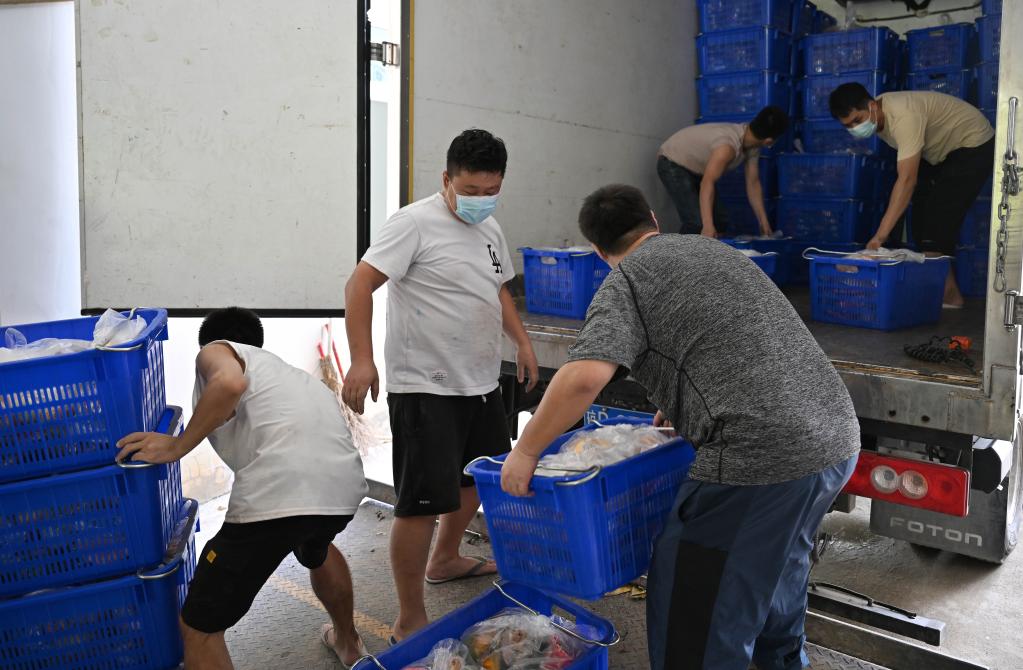 Staff members unload vegetables in Sanya, south China's Hainan Province, Aug. 8, 2022. Task forces have been established to work around the clock to ensure daily life supplies for local residents and stranded tourists in an effort to fight against the new resurgence of COVID-19 in the city. (Xinhua/Guo Cheng)