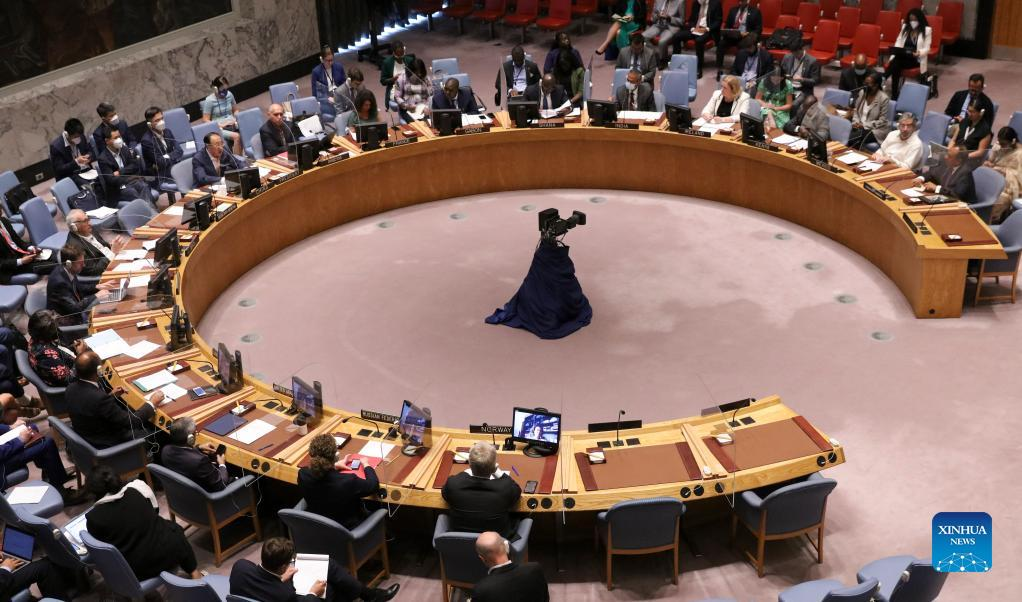 Photo taken on Aug. 8, 2022 shows the scene of a UN Security Council open debate convened by China on the theme "Peace and security in Africa: capacity-building for sustaining peace" at the UN headquarters in New York. Zhang Jun, China's permanent representative to the United Nations and president of the UN Security Council for August, on Monday called on the international community to support Africa in enhancing capacities to secure durable peace in a comprehensive approach. (Xinhua/Xie E)