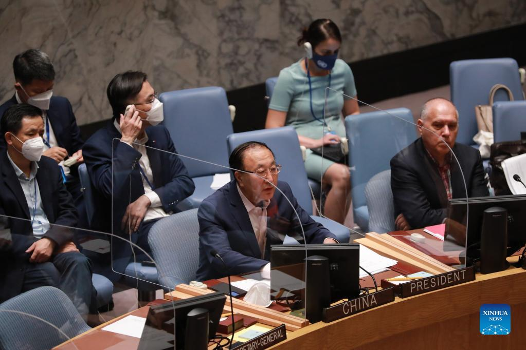 Zhang Jun (C), China's permanent representative to the United Nations, speaks at a Security Council open debate convened by China on the theme "Peace and security in Africa: capacity-building for sustaining peace" at the UN headquarters in New York, Aug. 8, 2022. (Xinhua/Xie E)