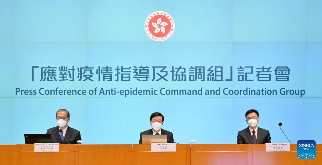 Chief Executive of the Hong Kong Special Administrative Region (HKSAR) John Lee (C) attends a press conference of the Anti-epidemic Command and Coordination Group in Hong Kong, south China, Aug. 8, 2022. (Xinhua)