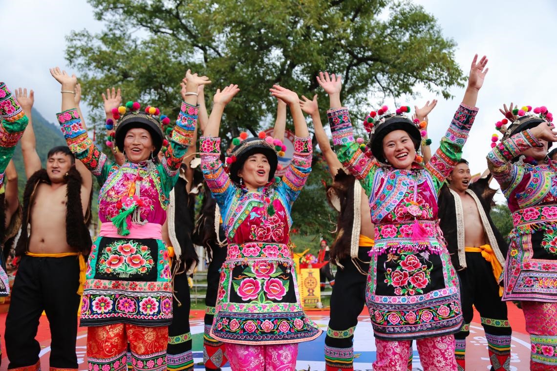 People are dancing at a ceremony held in Guangming village, Yangbi Yi autonomous county, Dali Bai autonomous prefecture, southwest China's Yunnan province to pray for the harvest of walnuts, Sept. 1, 2018. (People's Daily Online/Li Faxing)