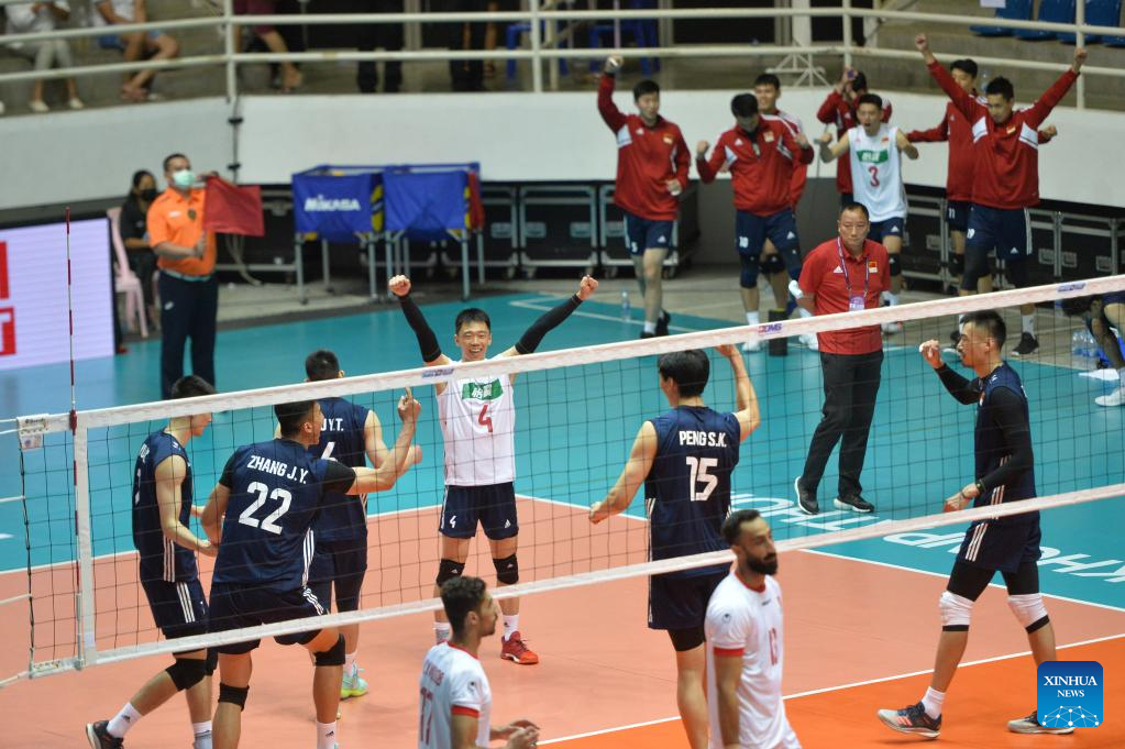 Players of China celebrate during a 2022 AVC (Asian Volleyball Confederation) Cup match between China and Bahrain in Nakhon Pathom, Thailand, on Aug. 9, 2022. (Xinhua/Rachen Sageamsak)