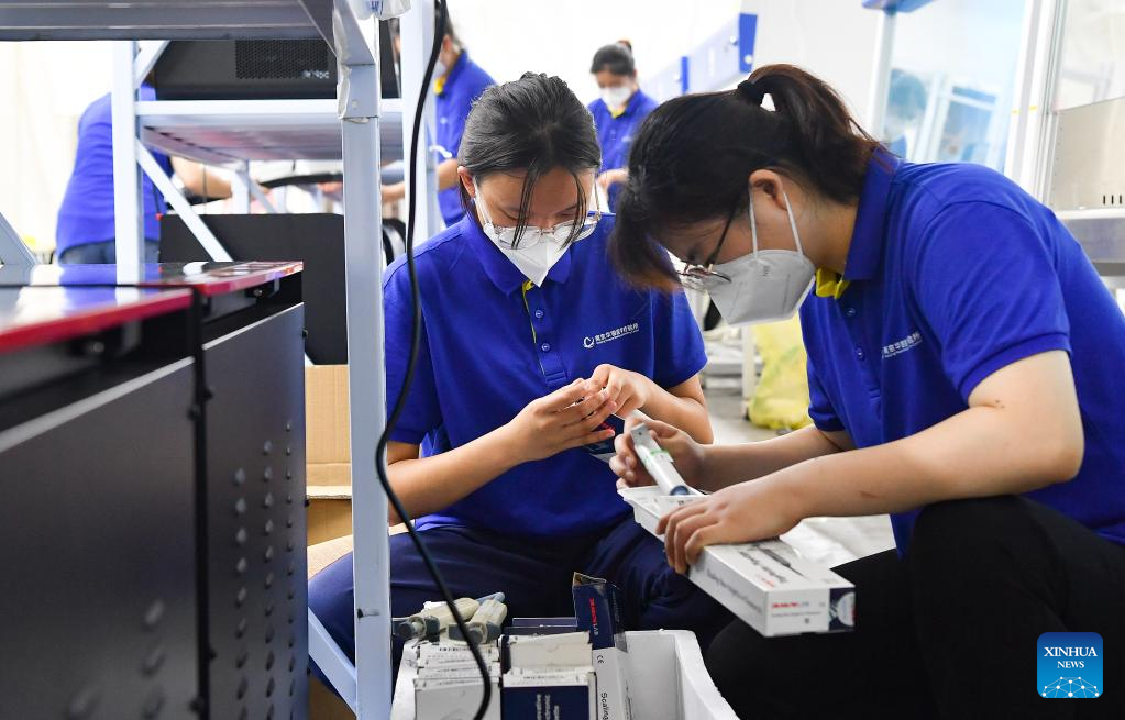 The labs, some of which built with aid from east China's Shanghai and Jiangsu Province, can test about 230,000 tubes of nucleic acid samples on a daily basis. (Xinhua/Yang Guanyu)